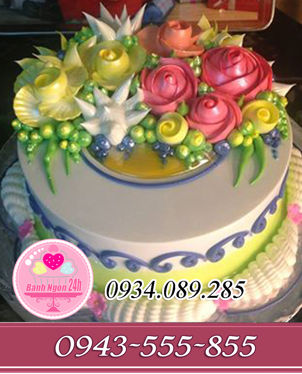 Đánh Giá: Bánh kem nghệ thuật trang trí hoa chế tông vàng đỏ nụ xanh